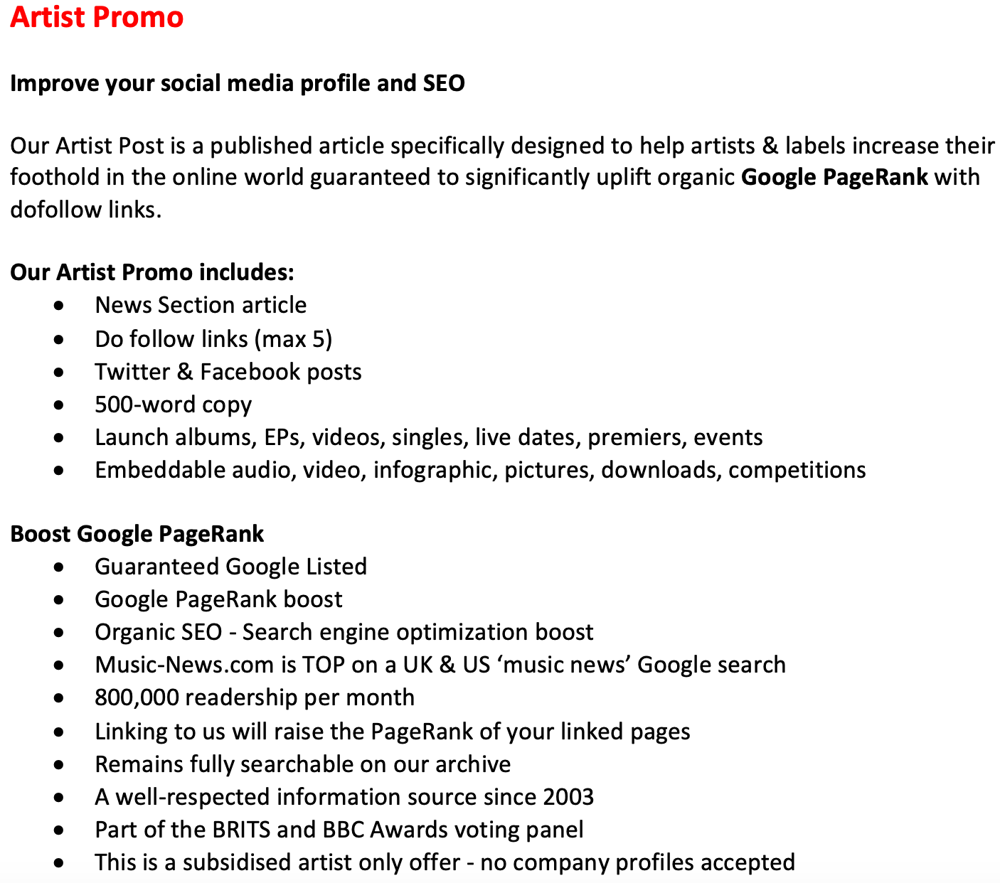 Our £50 not-for-profit Independent Artist Offer is heavily discounted from our £750 - £1,250 Guest Post.